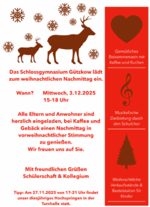 « Alle Veranstaltungen Weihnachtlicher Nachmittag 3 Dezember @ 15:00 - 18:00 « Hochsprung mit Musik Tag der offenen Tür » Details Datum: 3 Dezember Zeit: 15:00 - 18:00 Veranstaltungskategorie: Schlossgymnasium Veranstaltungsort Schlossgymnasium Gützkow Baron-von-Lepel-Platz 2 Gützkow, 17506 Deutschland Google Karte anzeigen Telefon 038353257 Veranstaltungsort-Website anzeigen Veranstalter Schlossgymnasium Gützkow Telefon 038353257 E-Mail Schlossgymnasium-Guetzkow@kreis-vg.de Veranstalter-Website anzeigen